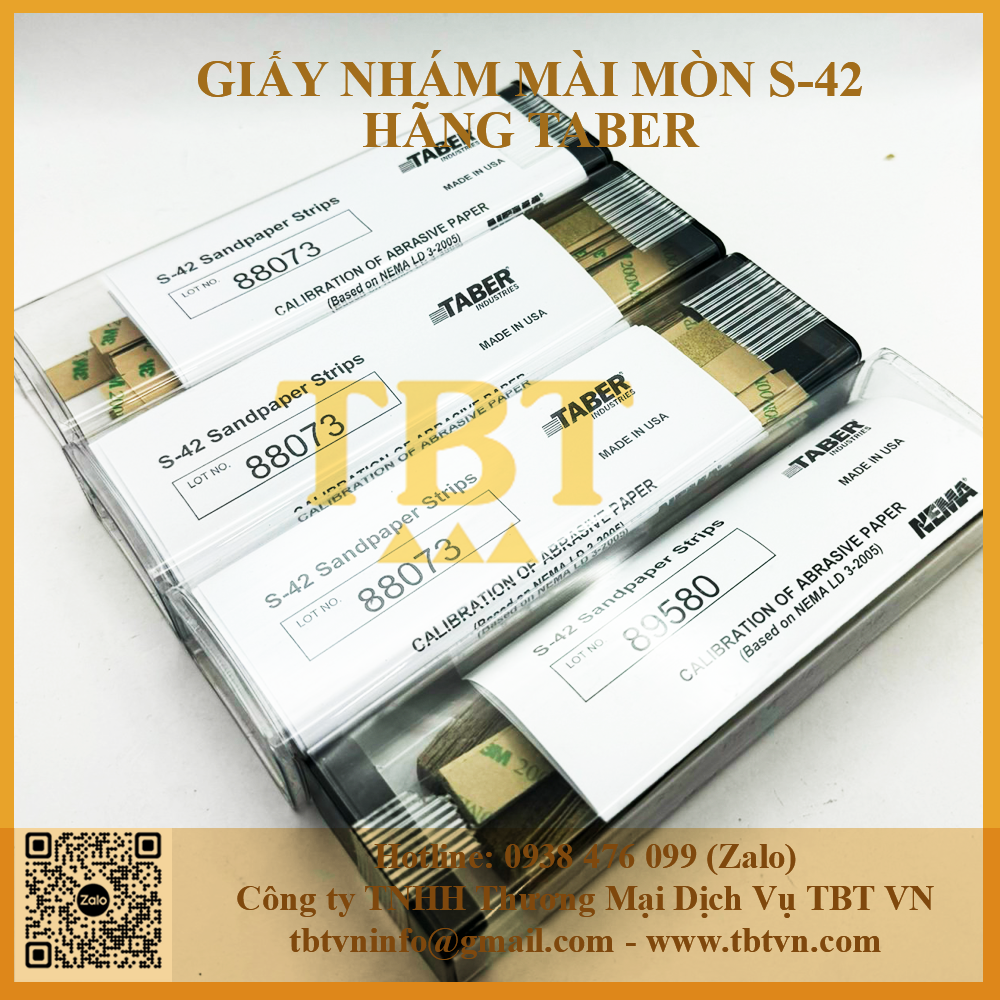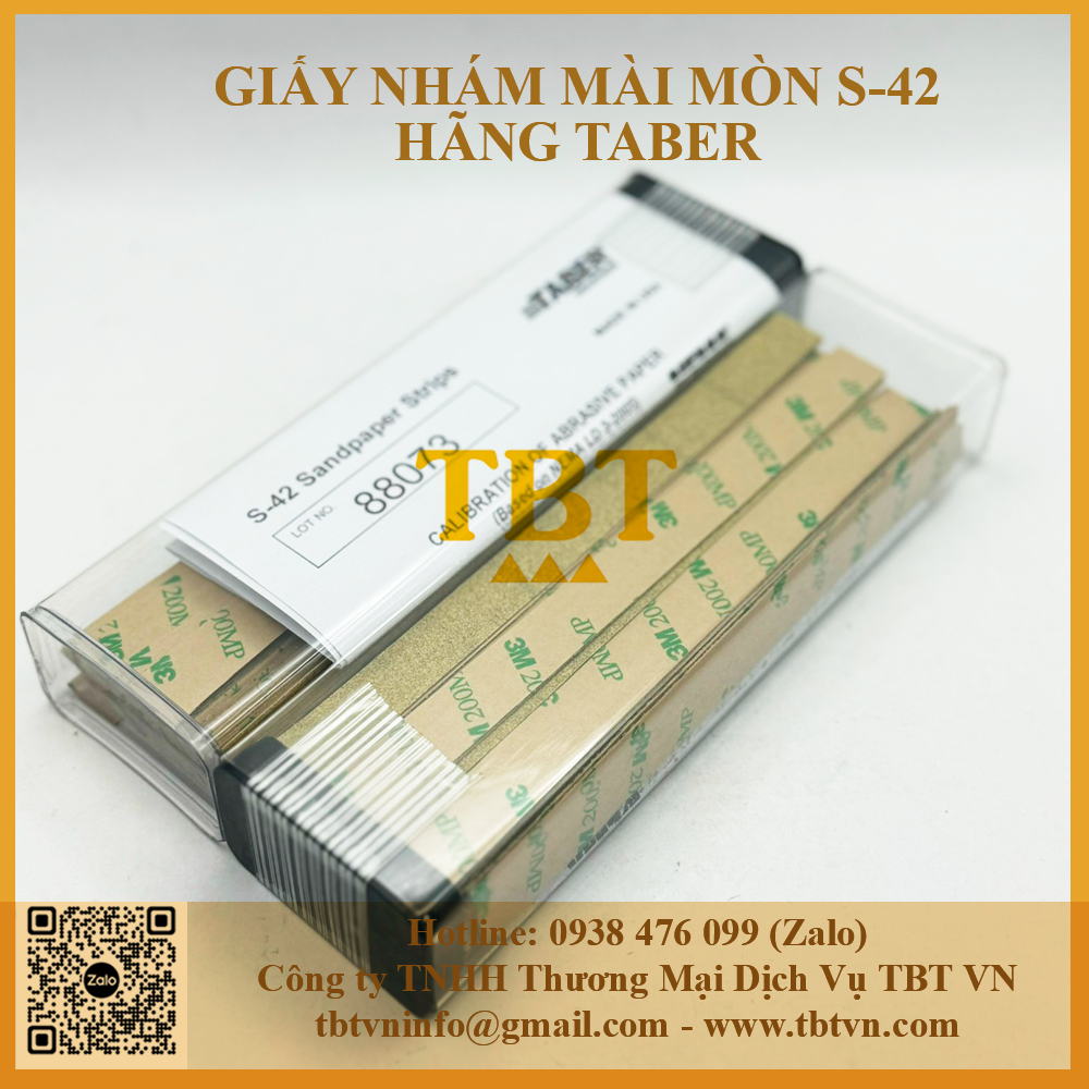 - Giấy nhám mài mòn hãng Taber S42 bao gồm các hạt oxit nhôm rất mịn có kích thước trung bình khoảng 78um, phân loại 180 ANSI-CAMI, chúng được kết dính với nhau tạo thành 1 dải dài.