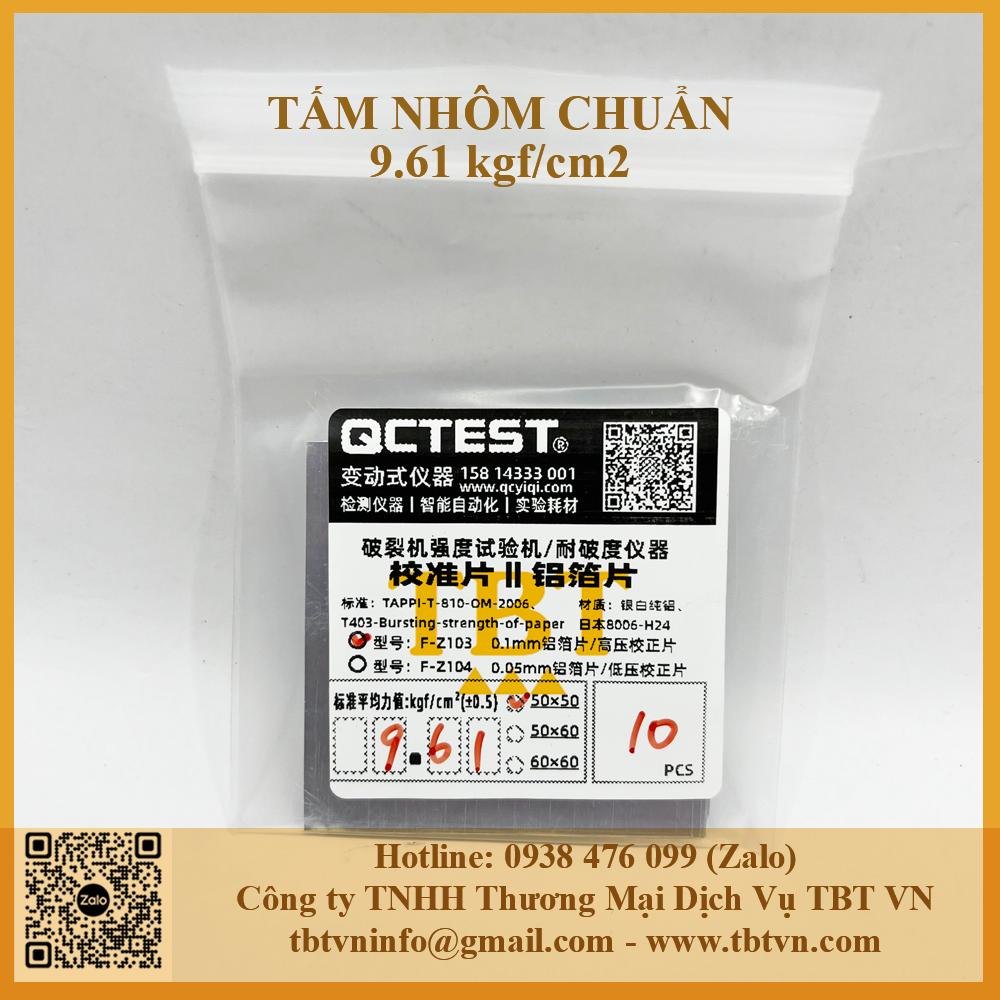 - Sau một thời gian sử dụng máy kiểm tra độ bục sẽ gây ra sai lệch nên Tấm nhôm chuẩn 9.61kgf được sử dụng để hiệu chỉnh lại giá trị đúng cho máy bắn bục giấy, carton, màng bao bì…